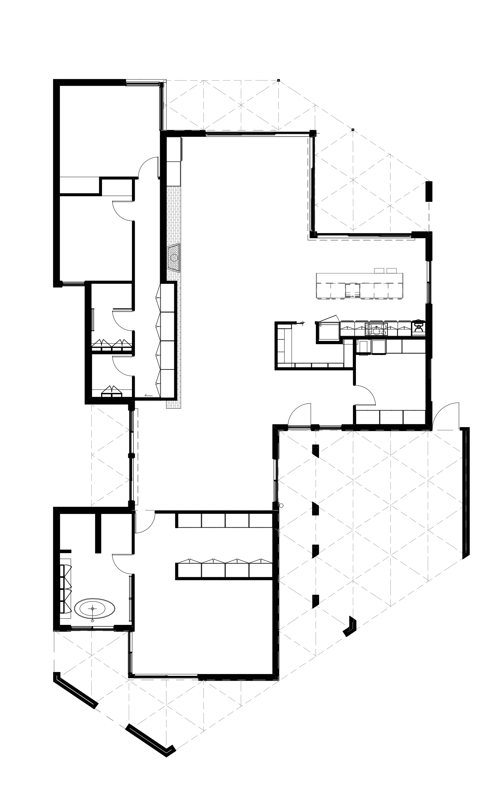 Situated along a residential street, the use of external red brick engages local community character - at the facade angled brick walls are offset from the dwelling to provide support for patterned timber beams overhead. This depth at the front and rear delineate opportunities for inside / outside spaces that are privately screened by the angled walls and are passively shaded by the patterned beams. For continuity, external red brick runs into the house, across the living room wall as a non combustible platform for a wood fireplace.
