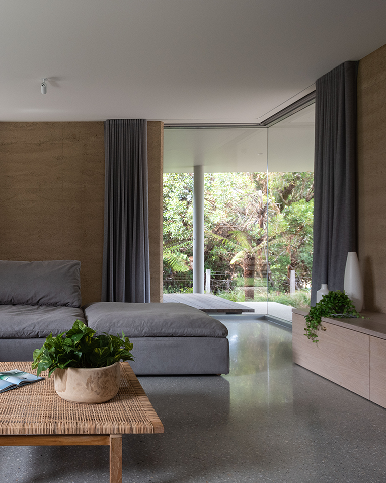 The building facade is formed of a large balcony - used as an outdoor lounge and dining space with generous views over the Great Ocean Road, it is supported by pilotis columns and rammed earth walls. Upon arrival - the balcony forms a sheltered carport and entry way into the house.